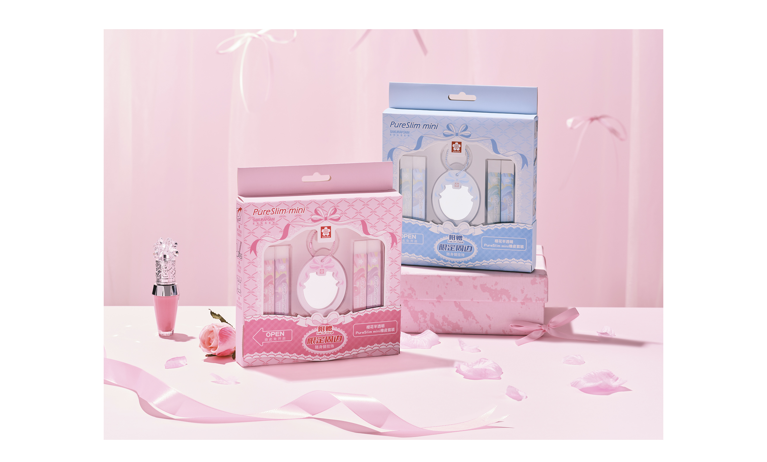 5. 体现产品化妆品concept以及送礼属性的周边限定套装(2款套装,附赠限定周边随身镜挂件)。